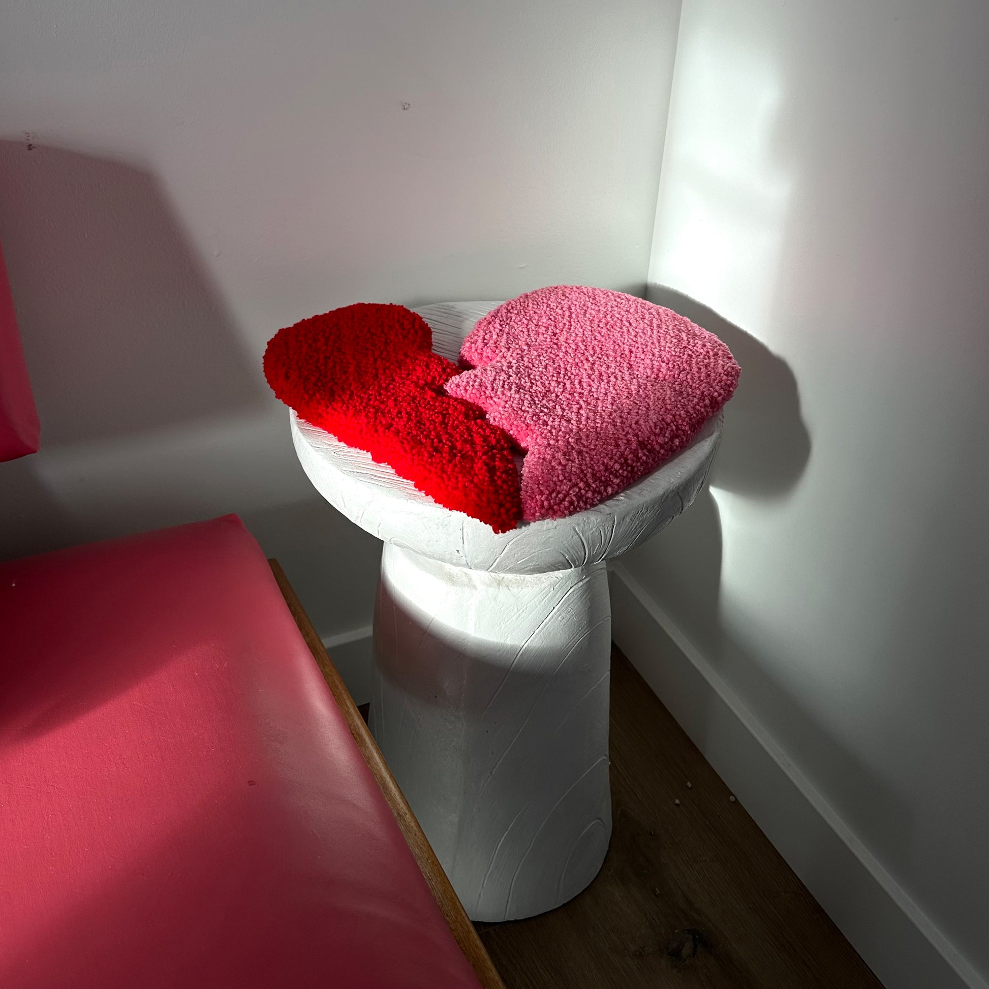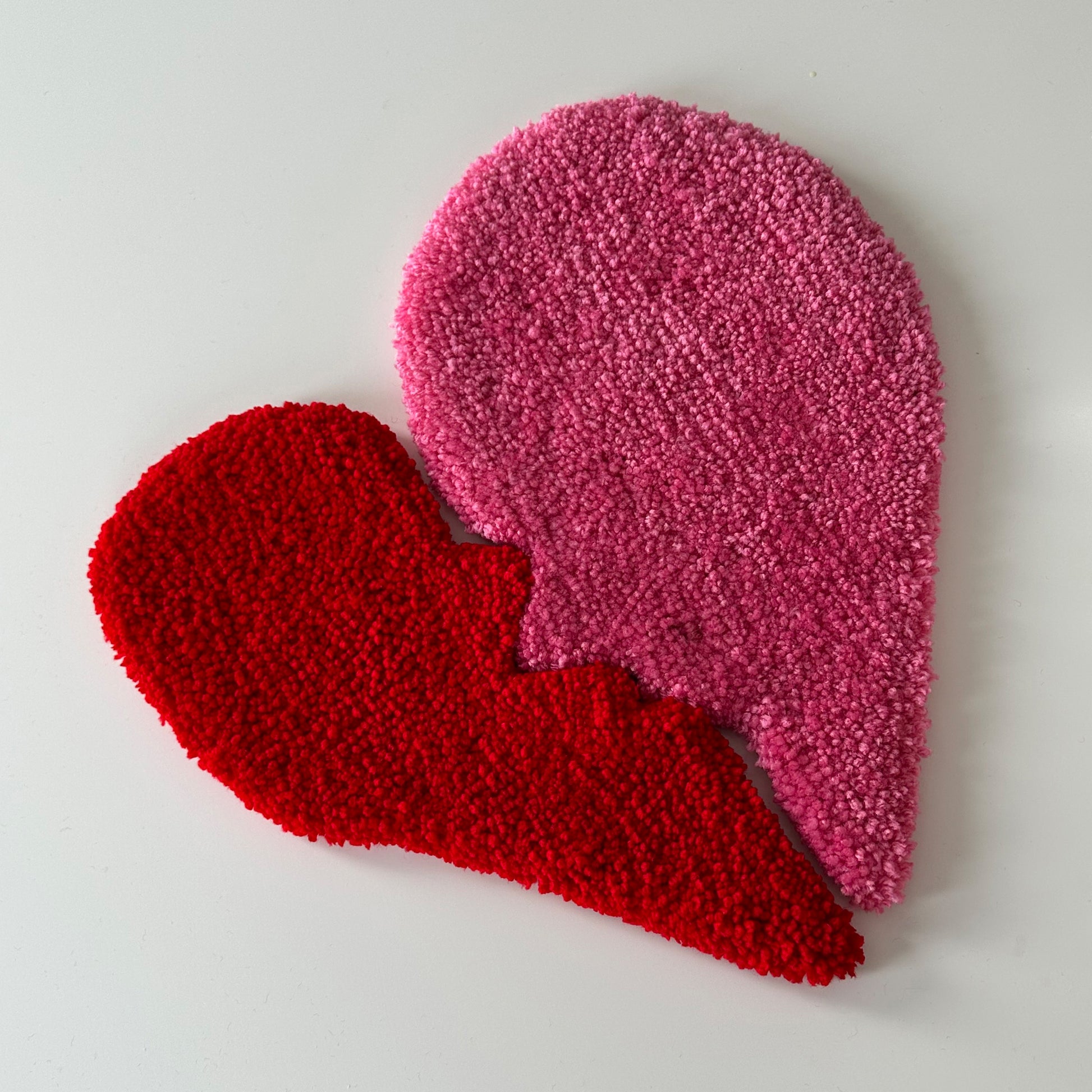 Hand tufted broken heart mini rugs for you to hang anywhere in your home or use as a coaster for your favourite things. Made with 100% acrylic yarn.