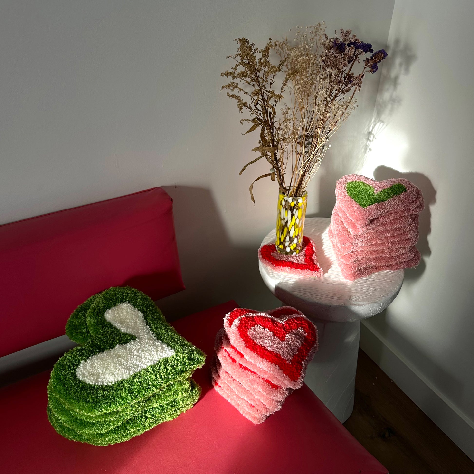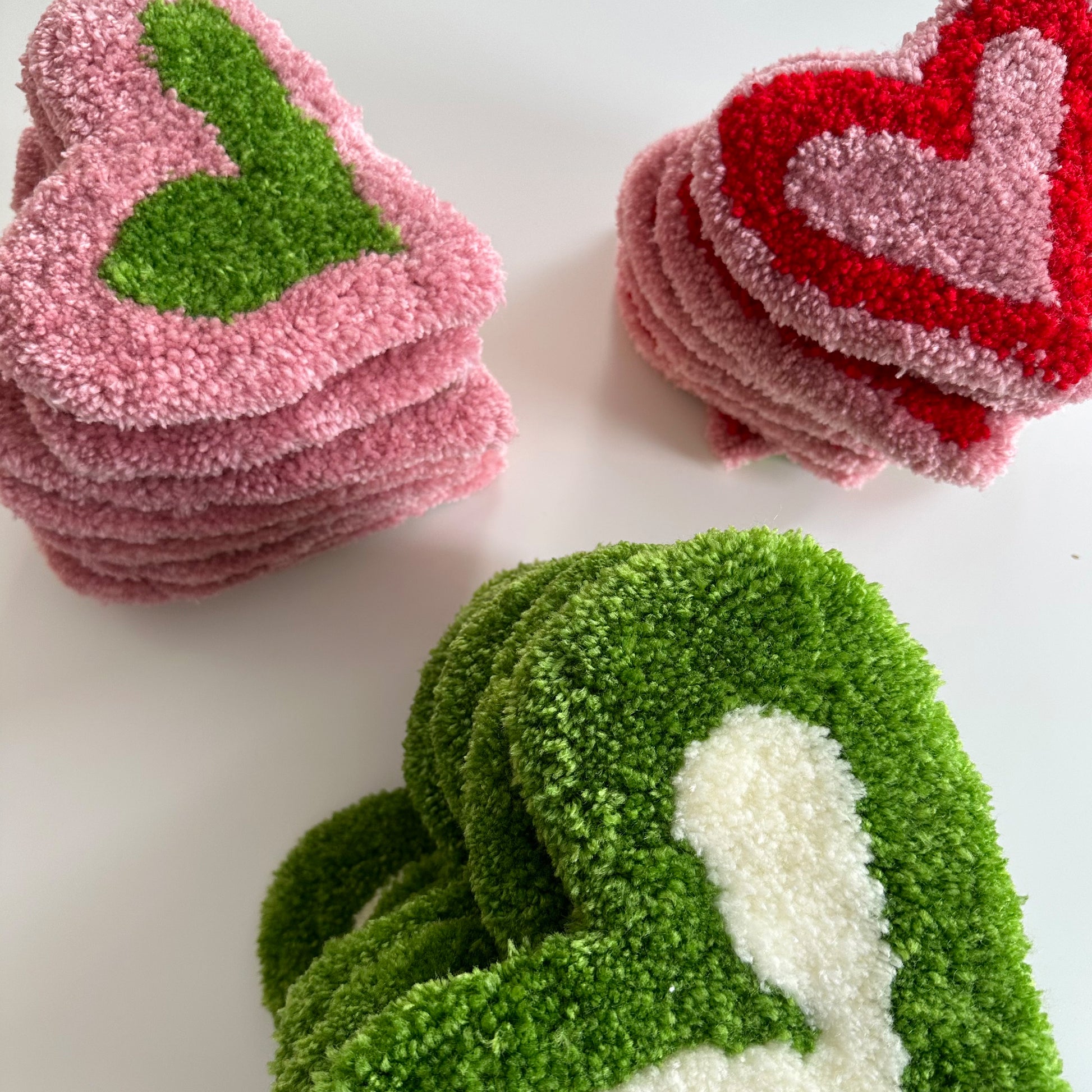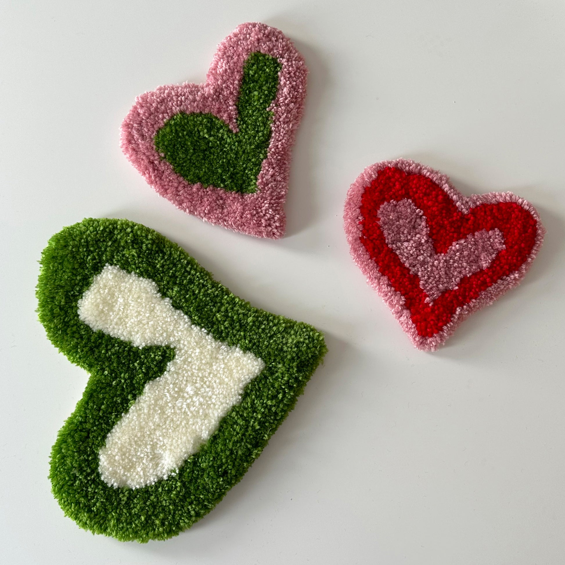 Hand tufted set of 3 heart BB's for you to hang anywhere in your home or use as a coaster for your favourite things. Made with 100% acrylic yarn.