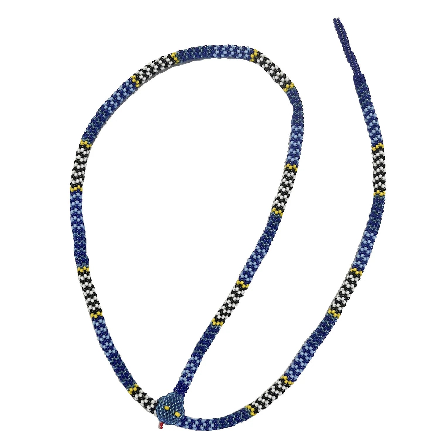 In a continuous cycle of death and rebirth. Daily changes, life-long growth, constant renewal. The Racer Ouroboros is a blue, baby blue, metallic blue, yellow, black and white stripped snake that eats its own tail - can be worn in multiple ways.